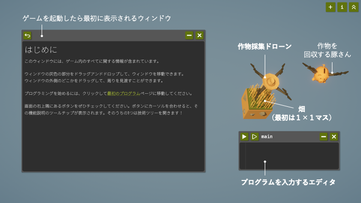 このゲームの目的は、「プログラミングで農作業を効率化すること」です。プレイヤーはドローンをプログラムで操作し、畑の収穫作業を自動化します。そして、収穫した作物を使って、畑を拡張したり、より高度なプログラミング構文を解除したりして、作業効率をどんどん上げていきます。