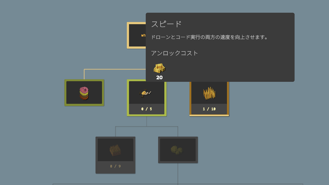 アンロックツリーを解除していくことで、農場を拡大したり、より高度なプログラム構文を使用したりできるようになります。