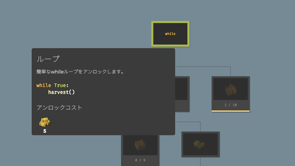 たとえば、最初のツリー「ループ」を解除するには「5つの干し草」が必要です。そこで、先ほどの動画の要領で干し草を5つ集めて、最初のツリーを解除すると「while文」が使えるようになります。これでループ処理ができるようになったので、何度も実行ボタンを押さなくても、自動的に収穫が繰り返されるようになります。